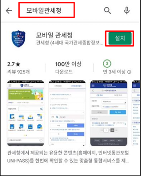 ① '모바일 관세청' 앱 설치 : 플레이스토어(안드로이드) 또는 앱 스토어(아이폰)에서 '모바일 관세청' 검색 후 설치