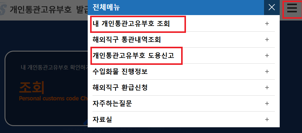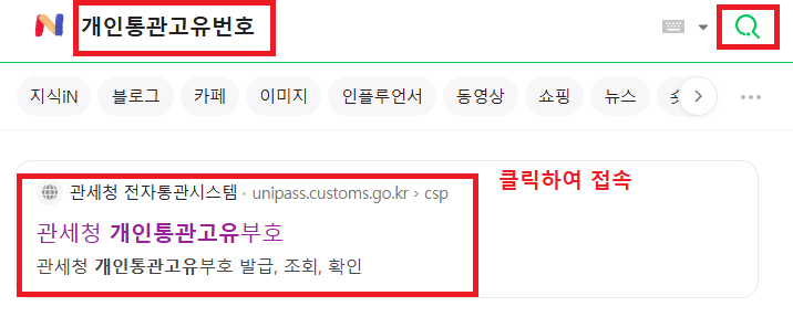 ① 포털 사이트에서 '개인통관고유번호(부호)' 검색 > 조회하기