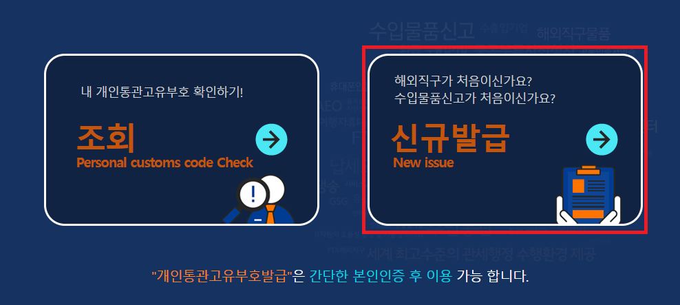 > 개인이 수취하는 전자상거래 물품에 대하여 내국인과 외국인 모두 개인통관고유부호를 발급받아야 합니다.