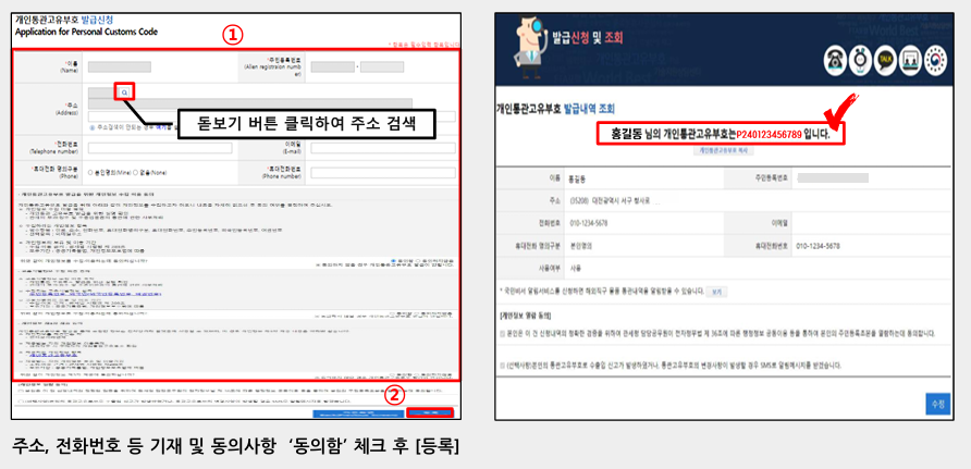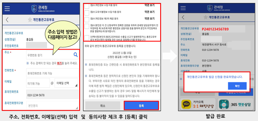 ④ 신청서 작성 후 [등록] > 발급된 개인통관고유부호 확인