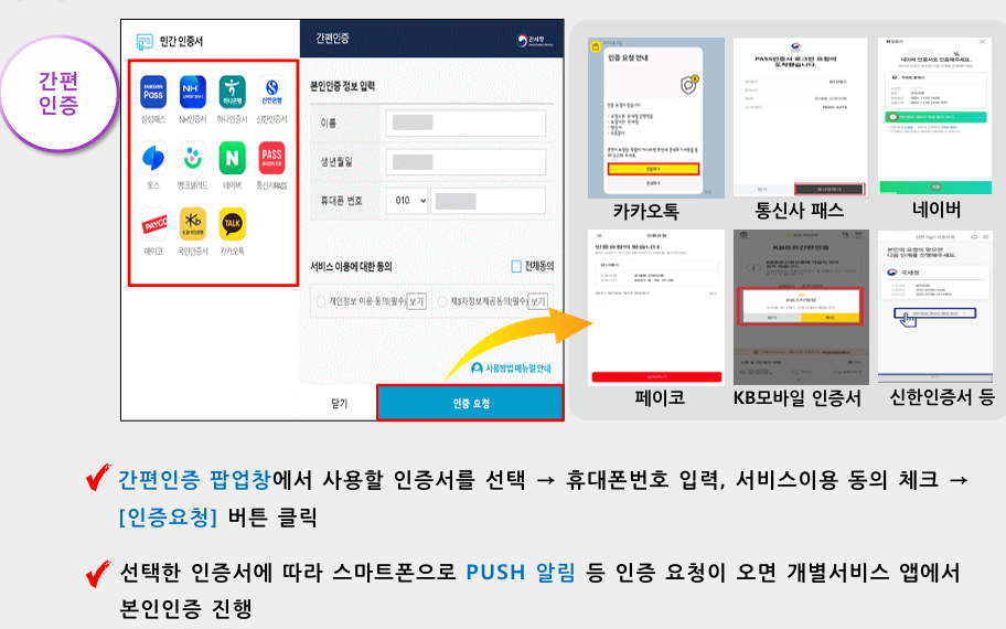 ③ 본인인증 방법 '휴대폰 인증', '공동/금융인증서 인증', '간편인증' 중 한가지 선택