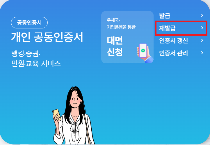 - 한국정보인증 사이트 메인화면 > 개인 공동인증서 > 재발급 > 신청번호 / 발급용 임시번호 입력