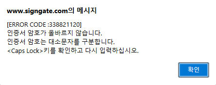 3. 인증서 선택 > 비밀번호 입력해서 찾기 > 틀리면 아래와 같은 화면 팝업 창으로 뜸 > 계속 진행