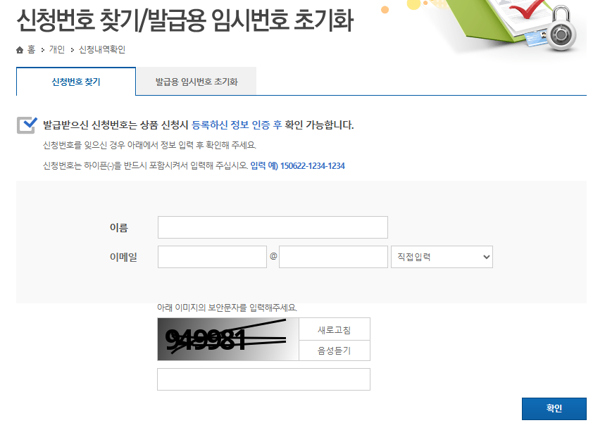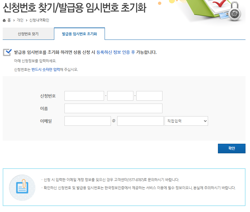 * 신청번호를 받았다면 발급용 임시번호 초기화 탭에 들어가 신청번호, 이름, 이메일 주소 입력하면 됩니다.