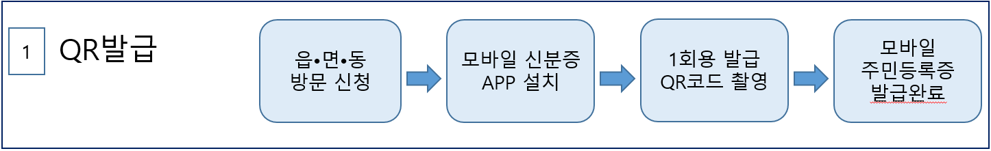 * 읍•면 •동 주민센터 방문하여 모바일 주민등록증 발급을 위해 생성되는 1회용 QR코드를 촬영하여 발급 가능합니다.