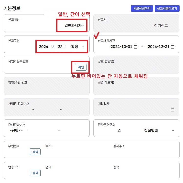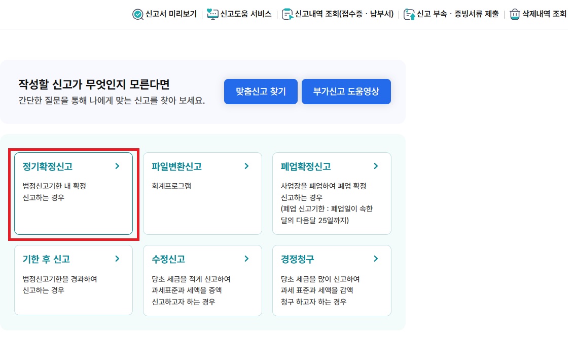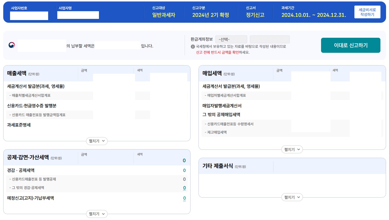 - 2기 확정신고 : 다음 해 1월 1일부터 1월 25일까지.(매출매입기간은 7월부터 12월까지)