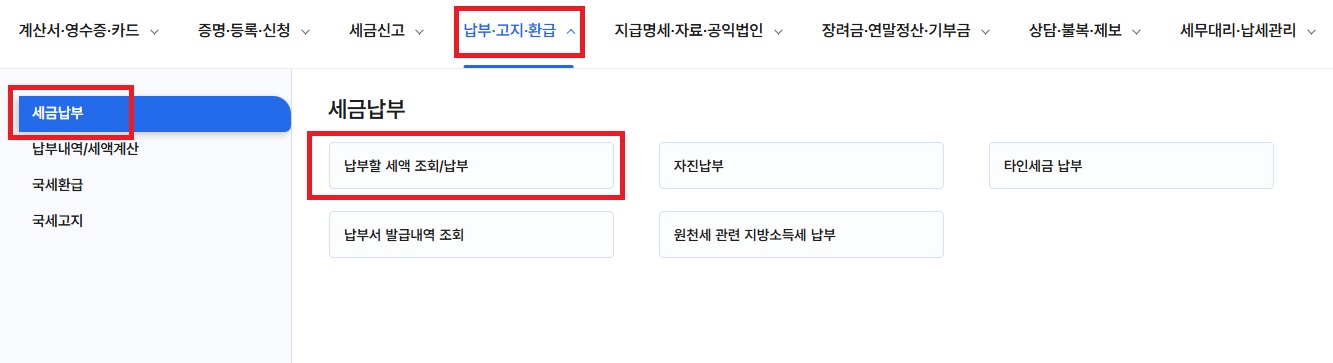 - 신고 후 따로 납부하려면 홈택스 로그인 ➡ 납부·고지·환급 ➡ 세금납부 ➡ 납부할 세액 조회/납부 ➡ 납부