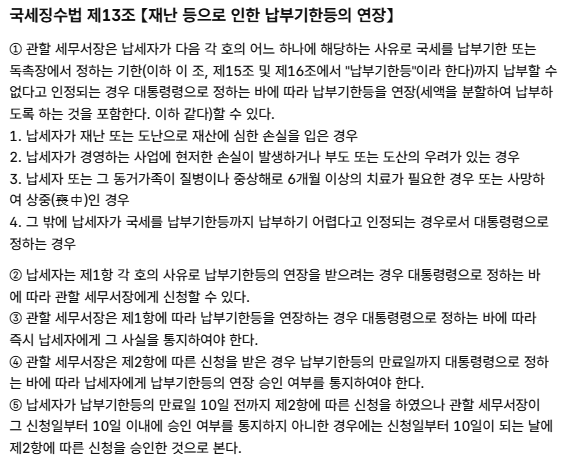 납부할 세액이 500만 원을 초과할 경우, 초과 금액에 대해 분납이 가능합니다. 납부기한등 연장은 납부기한 만료 3일 전까지 가능합니다. 재난·질병·사업상 위기 등의 사유로 납부기한까지 세금 납부가 어려운 경우 연장 신청하는 서비스로 연장 기간은 법정 납부기한 후 최대 9개월까지 가능합니다. 연장은 세무서에서 검토하여 승인받을 경우에 가능합니다. 수정신고 및 기한 후신고는 분납 신청 대상에서 제외됩니다.