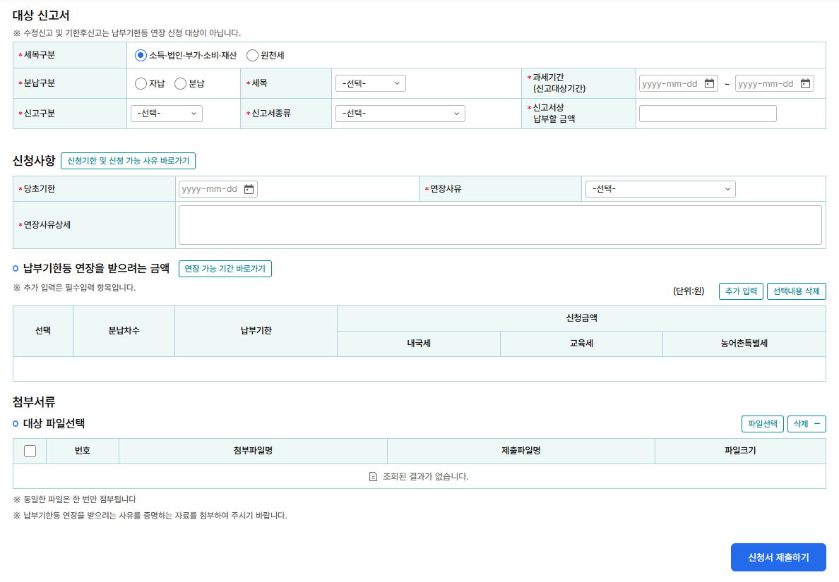 3. 분납 신청 방법 : 홈택스 홈 > 증명·등록·신청 > 세금 관련 신청·신고 공통분야 > 신고·납부 기한연장 신청/내역 조회 > 신고기한 연장신청 > 정보 및 분납 신청사항 기재, 분납 금액 작성 > 신청서 제출하기