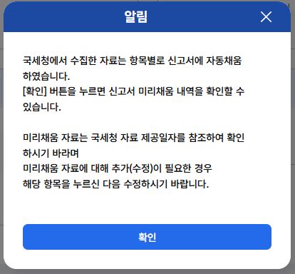 요새는 홈택스도 많이 좋아져서 미리채움 서비스가 생겼네요! 누르고 부족한 부분 추가로 입력하면 됩니다. (종이세금계산서, 차량 공제 부분 등)