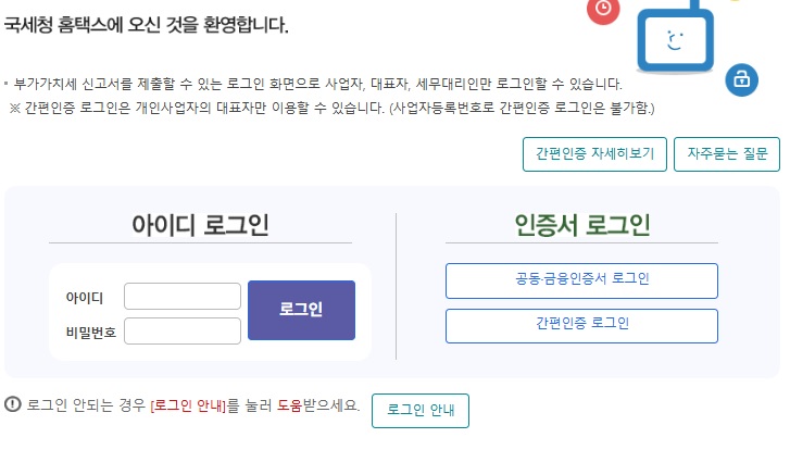 * 부가세 신고기간에는 홈택스 메인화면에 부가가치세 신고서비스 바로가기가 떠 누르고 로그인하면 바로 신고 화면 뜹니다.