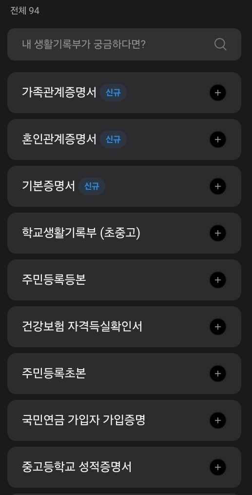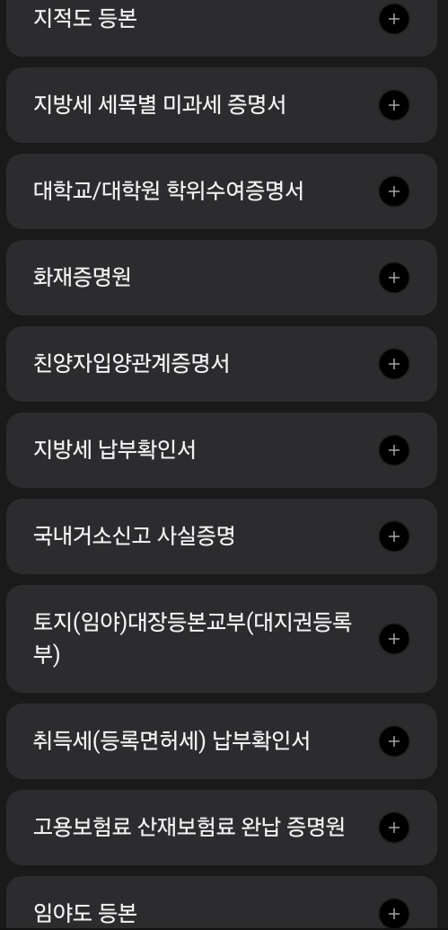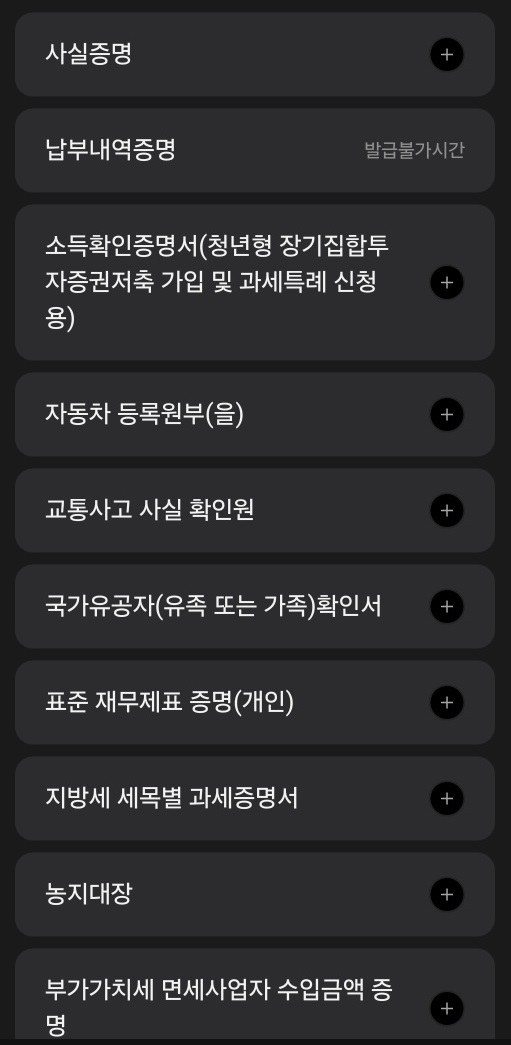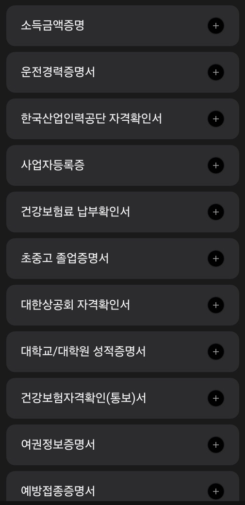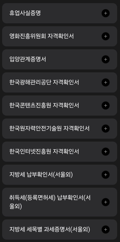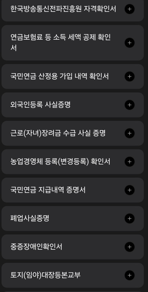 원하는 증명서 종류를 선택합니다. 예를 들어, 주민등록등본을 발급받으려면 해당 메뉴를 클릭합니다. +버튼 누르면 됩니다.
