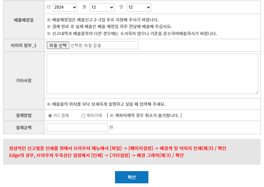 배출신고 및 결제부터 순서대로 입력 (휴대폰 본인 인증 필요할 수도 있음)