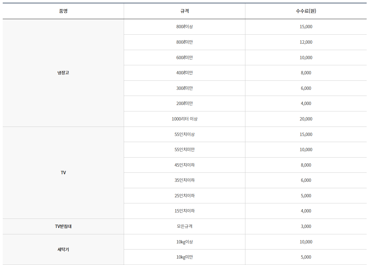 * 해당 표에 지정되지 아니한 대형폐기물은 종류와 규격을 감안하여 유사품목의 수수료를 준용한다고 합니다.