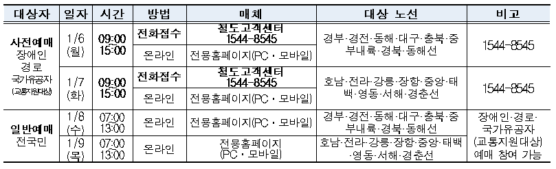 - 25.1.7(화) : 호남, 전라, 강릉, 장항, 중앙, 태백, 영동, 서해, 경춘선 - 예매좌석 : 1인당 1회 6매, 왕복 최대 12매까지 예약 가능