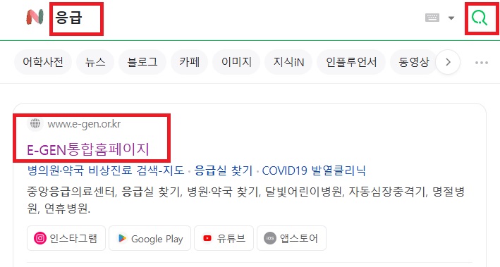 1. 인터넷 검색 창에서 '응급' 검색 후 응급의료포털 E-Gen 접속