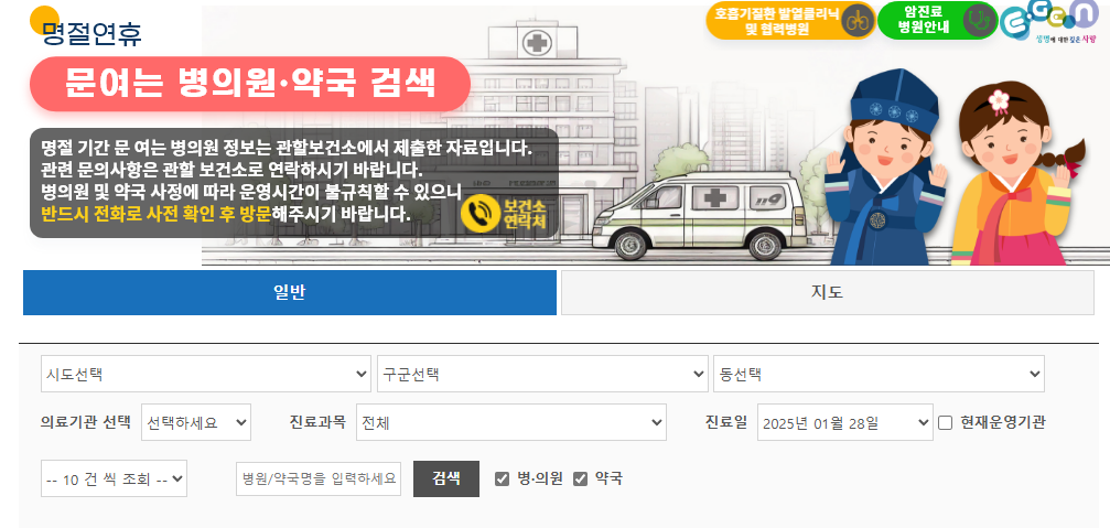 명절 기간 동안 병원과 약국을 찾기 어려운 상황을 예방하기 위해 정부는 전국적으로 특정 병원과 약국을 지정하여 운영하도록 하고 있습니다.