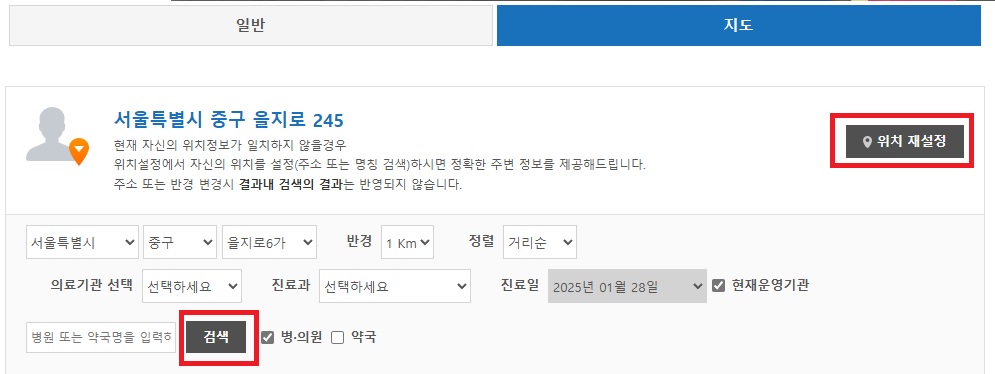 3. 현재 위치에서 가장 가까운 곳이 궁금하다면 지도에서 내 위치 검색하여 운영 중인 병원 또는 약국 검색