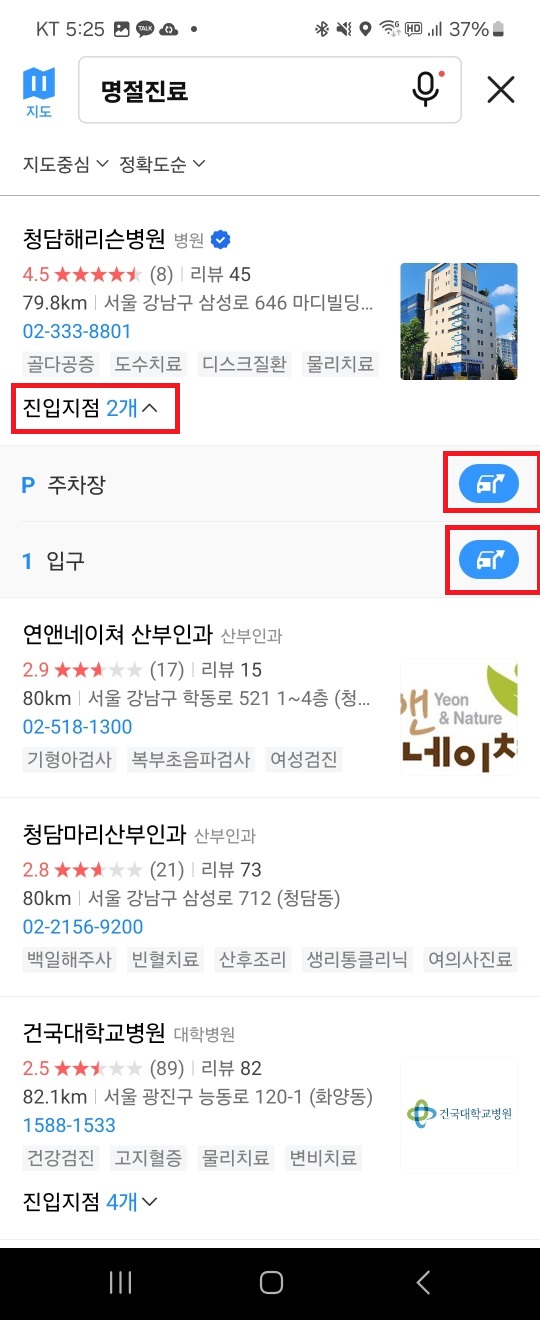 ☑ 플레이 스토어 "카카오맵" 검색 후 다운로드 > 명절진료 탭 검색 > 진입지점 누르고 원하는 곳으로 길 찾기